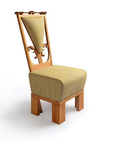Der Stuhl kombiniert eine voluminöse Polsterung in leuchtendem Gelb mit einer robusten Struktur aus massivem Lärchenholz, die mit handgearbeiteten Pflaumendetails verziert ist.