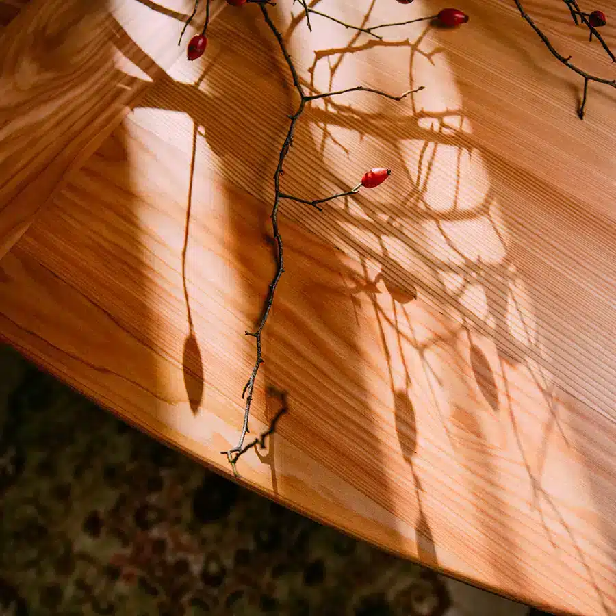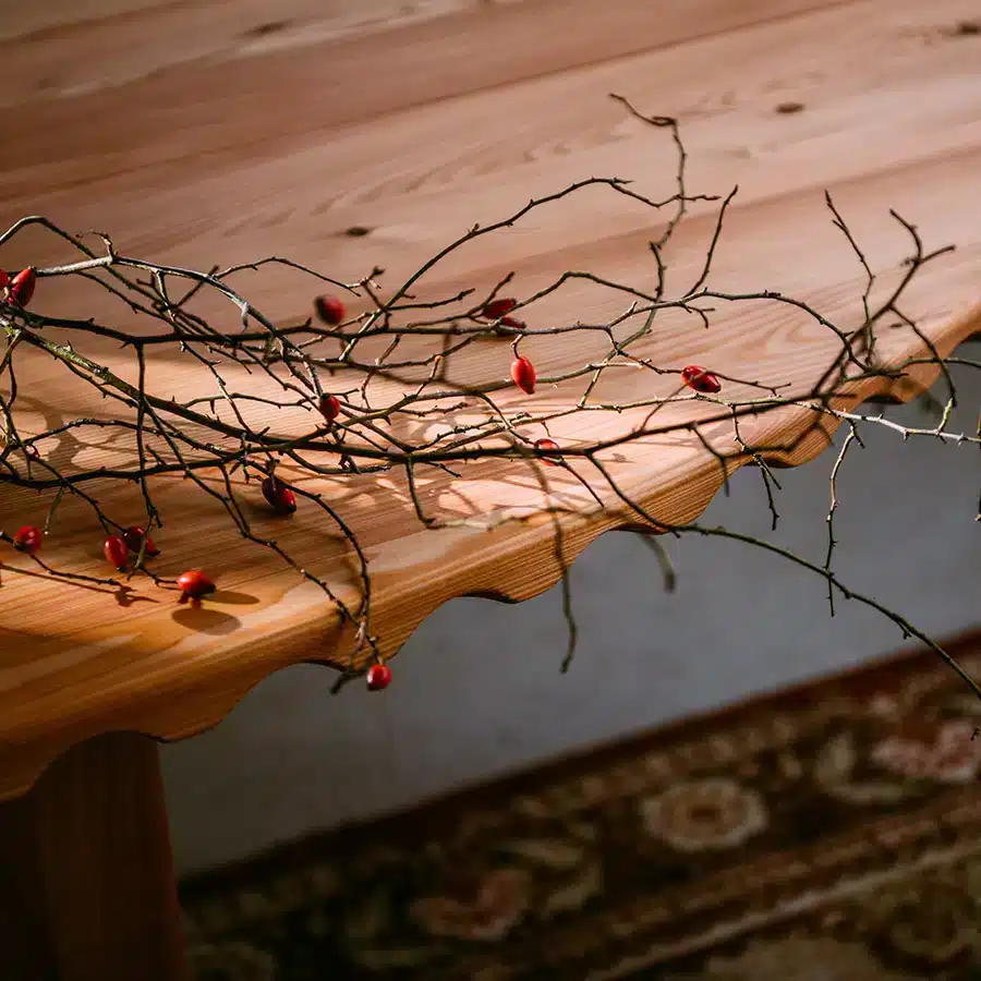 Za osnovo izbranih kosov uporabljamo macesen, pogosto v kombinaciji s slivo, iz katere so izdelani dekorativni vložki na stolih. Slivin les prinaša naraven rdečkasto-topel podton, ki pohištvu doda globino in unikaten značaj.