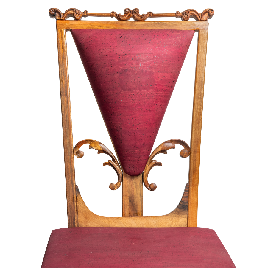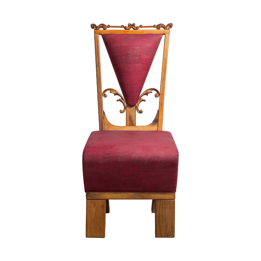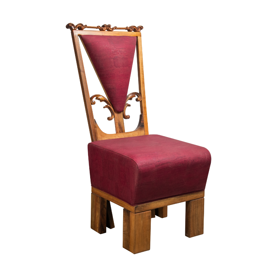 Stol združuje masiven macesnov/orehov les in ročno obdelane slivove detajle, zaščitene z lanenim oljem. Sedež in naslon sta oblazinjena z rastlinskim usnjem iz plute v odtenku svetlo rumene (Vanilla)/ rdeče (Wine) – trajnostnega in trpežnega naravnega materiala.