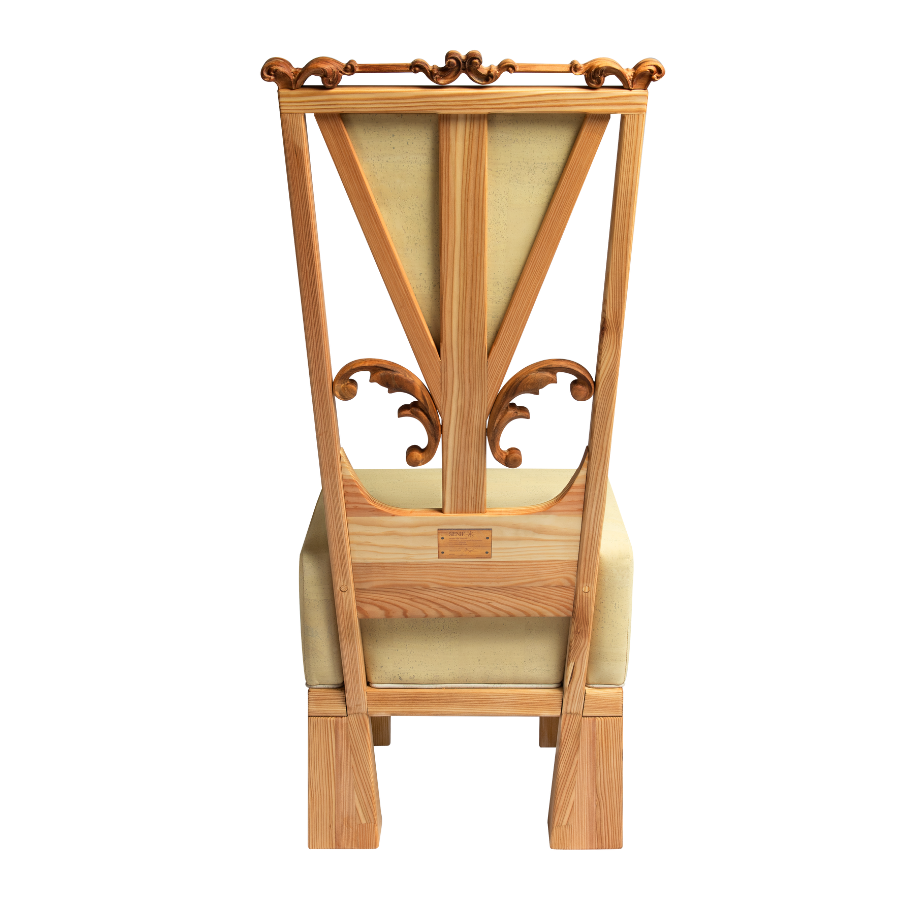 Kolekcijo zaznamujeta viktorijanska detajla na naslonjalu, ki ustvarjata preplet tradicije in sodobne oblike. Vsak stol je ročno izdelan v Sloveniji in odraža filozofijo trajnostnega oblikovanja Senik.