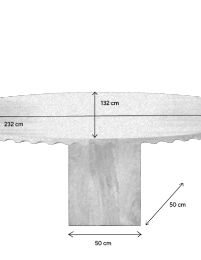 Masivna noga, premera 50 x 50 cm, zagotavlja stabilnost in postavlja mizo v središče prostora kot kiparski element. Površina jedilne plošče je oplemenitena z lanenim oljem, ki je bilo z božanjem vtrto v les, višek pa ročno odstranjen s krpo za poudarjanje naravne teksture in topline lesa.